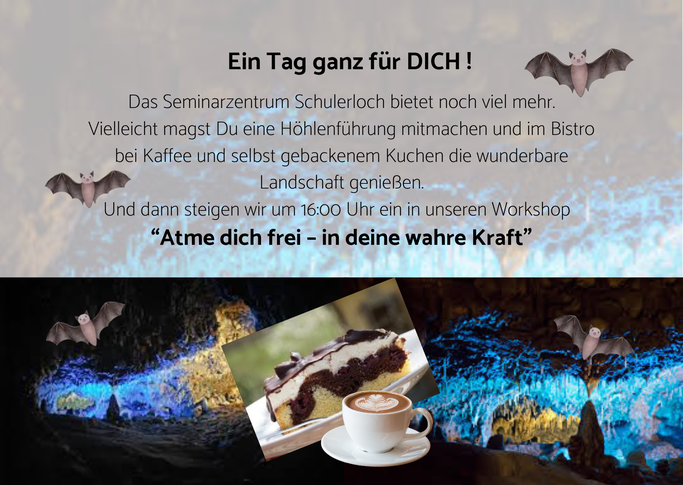 ACHTUNG von der Höhle bis zum Seminarzentrum musst Du einen Fußmarsch von min. 20 Minuten einplanen